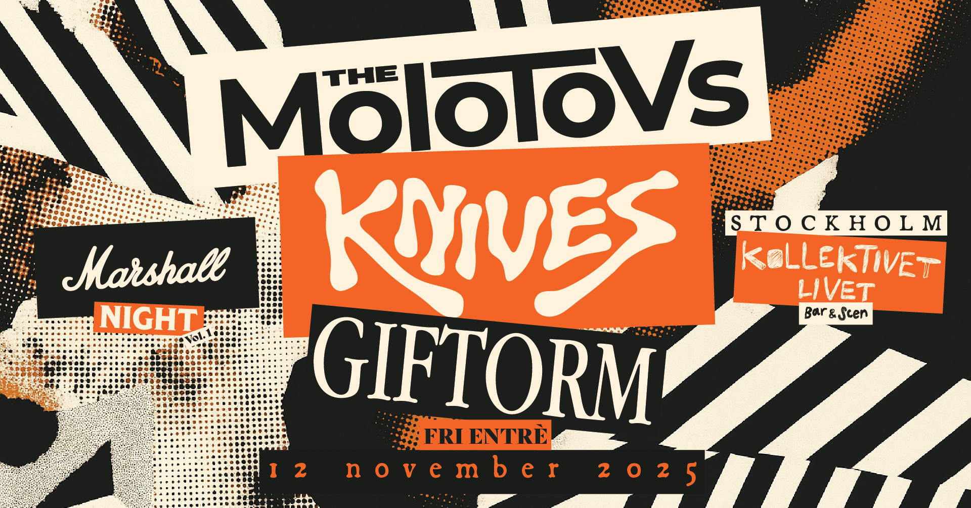 Marshall och Kollektivet Livet presenterar Marshall Nights den 12 november! Hela vägen från UK kommer The Molotovs och Knives from Marshalls egna record label. Tillsammans med det lokala supportbandet Giftorm kommer vi skapa en riktig musikfest – en kväll där vi blandar internationellt och lokalt och bara firar musiken med riktigt bra ljud.